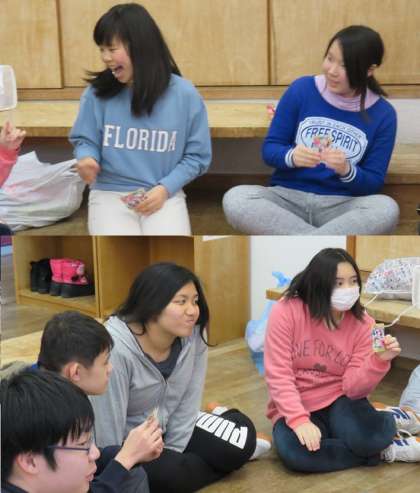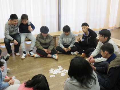 スポーツ活動が終わって、宿泊棟で着替えた後、みんなでトランプをして遊んでいます。