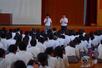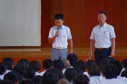 4月から始まりました第一学期も20日をもって一区切りとなりました。校歌斉唱の後、学校長より式辞がありました。校長先生から一学期の各学年の様子や感想が伝えられ、「この夏休みをどのようにしていきますか」という問いかけに、挙手をして自ら発表した生徒もいました。