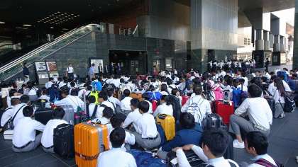 集合が完了し,京都駅において結団式が行われました。みんな5分前行動ができているようです。今回引率する教員,同行される業者の方々から挨拶と諸注意がありました。只今新幹線に乗り出発しました。これから博多に向かいます。
