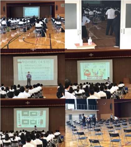 学校長からの「上を向いて進もう!」の力強い言葉に生徒全員が今後の自分の姿を見直したのではないでしょうか。続いて,生活面と保健面から大切な実践すべき具体的な項目や行動の話がされ,明日からの生活に不可欠な「人」としての心得が示されました。