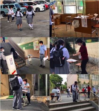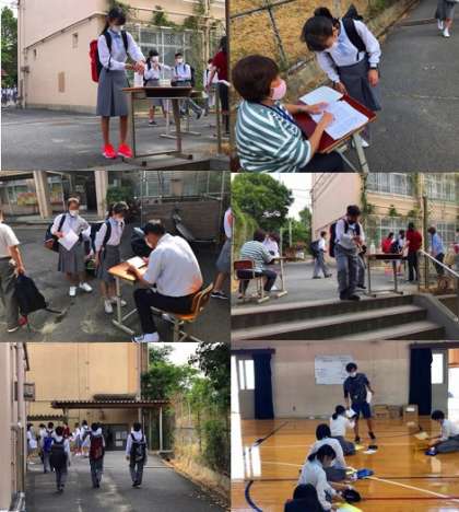 3学年のA班生徒は昨日同様にマスク着用で登校し,各学年校舎前に設定された「健康観察票」提出場所にて本日の健康状況を確認の上,教室に入りました。