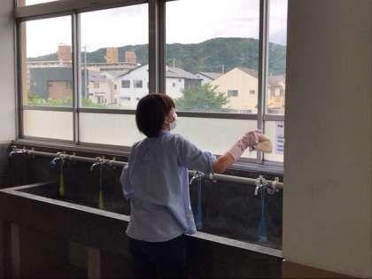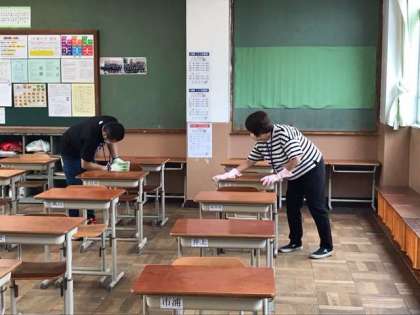 教職員も午前の授業終了後,直ちに全教室の「消毒」を行い,午後の授業に向かいます。そして,午後の授業が終了すると再度「消毒」を行っています。換気の放送は勿論の事,まずできる事から進めています。時間的にも身体的にも余裕がないのが現状ですが,この危機を教職員も全員で乗り越える覚悟で臨んでいます。