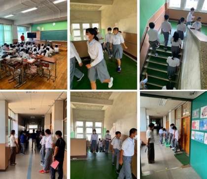 特にこれから台風の上陸が心配される季節でもあり,まず安全に避難できるように各担任から生徒に事前の説明をした後,全校放送を合図に一斉が各校舎の上階へ移動,待機わしました。どの学年も真剣に取組め,本番のための訓練ができたようでた。