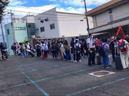 生徒達は大きな荷物を持ち,先程,クラス毎に担任を先頭にして出発しました。