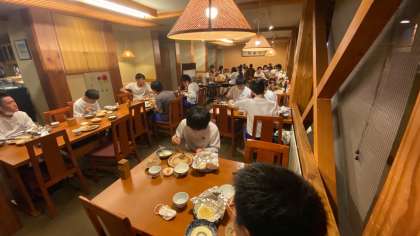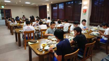 待ちに待った「夕食」の時間です。各テーブルには御馳走が準備されていますが,みんなややお疲れモードです。どうか,しっかり食べて,ゆっくり今夜も寝るようにしてください。