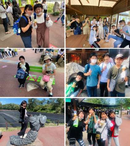 白馬ジャンプ台から「わさび園」へ移動し,昼食をとりました。昼食後には,大人気の「わさびソフトクリーム」を目指し,長蛇の列ができる程の盛況ぶりであったらしいです。どの画像を見ても,食べている時の顔は皆さん「幸せ」そうです。