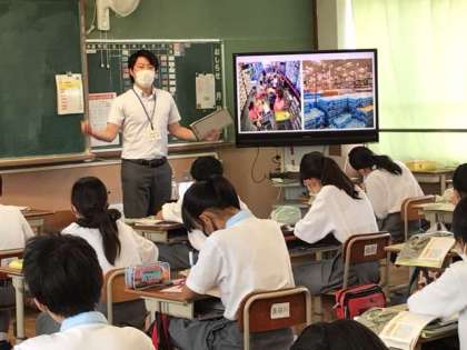 学校長,社会科の教員をはじめ実習生の在学する大学からも担当の先生が来校され,多くの教員が参観する中,「アメリカの人々の生活や文化について理解する」をテーマに1年1組の生徒に授業をすすめました。実習生の先生,本当にお疲れ様でした。