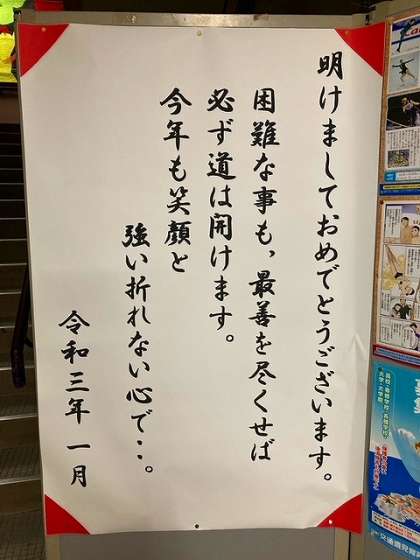 今年も校長先生から恒例の「大型年賀状」が職員室前に添えられ,登校してくる生徒に向けたメッセージが綴られていました。