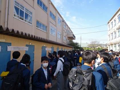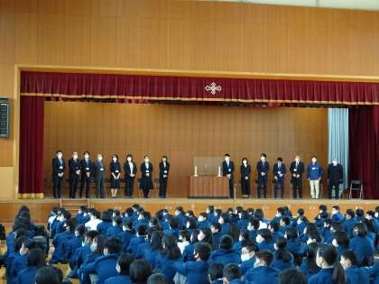4月6日(火)に着任式と始業式が行われました。はじめに今年度着任した古田知史校長先生の着任式を行いました。その後,校長先生から今年度赴任した16名の教職員の紹介がされました。つづいて赴任された先生方へ生徒からの歓迎の言葉と花束の贈呈がありました。始業式では校長先生の新しい年度に向けてのお話がありました。そしてドキドキの,新しい学級担任・副担任,部活動の顧問の先生の発表がされました。発表がされると歓声がもれました。そのような中でも,生徒一人ひとり,新しいスタートに向けた意欲満々の表情が印象的でした。