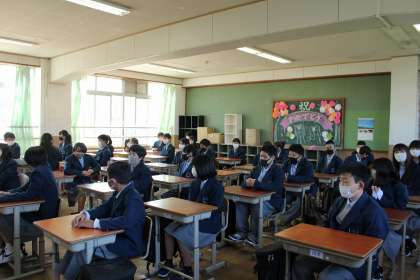 桜の花びらの舞う晴天の下,令和3年度第75回入学式が挙行されました。真新しい標準服に身をつつみ,満面の笑みで登校する新入生は,とても初々しい姿でした。クラス発表の後,入室した教室では緊張の面持ちでした。入学式の中での新入生の誓いの言葉は,人を大切にするという内容がとても心が温まるものでした。新入生にとって,明日から中学校生活が本格的にスタートします。何事にも失敗を恐れずチャレンジ精神で頑張ってほしいです。