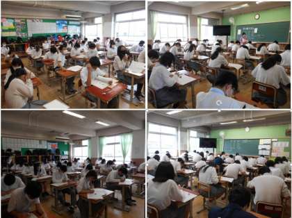 6月23日(水)〜25日(金)の3日間,第2回定期テストです。今年度初めて全学年統一での定期テストとなりました。どの学年も自習の時間や,休み時間にはテスト勉強のまとめを行う人,友達と問題を出し合いながら確認を行う人が見られました。テストに,とても前向きな姿勢が伺えました。テストが始まると,問題に一所懸命に取り組んでいました。明日からのテストも頑張ってください。