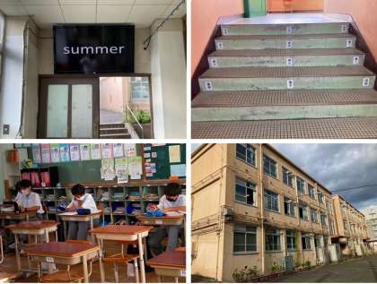 各校舎に設置されたモニターにはテスト範囲の英単語や漢字が映し出されたり,階段を利用したレトロな取り組みも始まっています。
