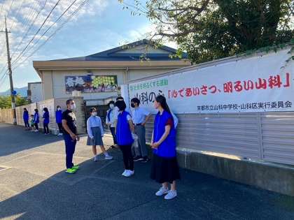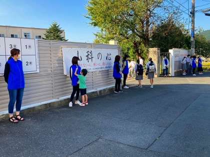 10月15日朝,晴天の中で恒例の「PTAあいさつ運動」が校門前と通学路(両小学校区)で行われました。