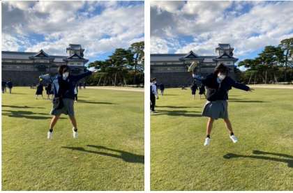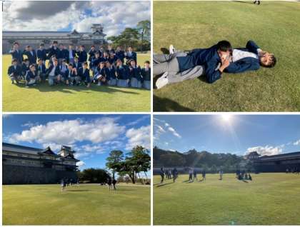 広大な芝生の上で金沢城を背景に学級写真を撮影しました。自由時間には鬼ごっこをする人、寝転ぶ人、いろんな人と写真を撮っている人、など、各々の時間を過ごしました。