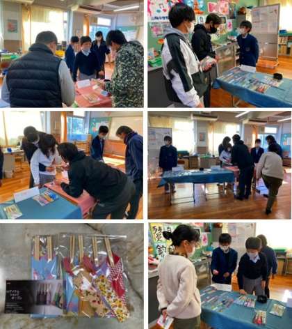 色とりどりの箸袋やきれいなしおりが陳列されており,先生方も予め配られた500円硬貨(玩具)で買い物を楽しみました。