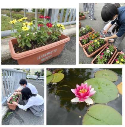 日ごろから校内緑化や校門横の山科川の橋の緑化に協力してくれている園芸部ですが,先日来取り組んでいる植え替えが完了したので,その中のジニアの摘心・切戻し剪定を行いました。これを行うことで脇枝が伸びて花数の多いしっかりとした株に育ちます。園芸部の皆さん,お疲れ様でした。中庭の池の蓮の花も開花しています。保護者の皆様,地域の皆様,学校にお立ち寄りの際はジニアの花と蓮の花をぜひご覧いただければと思います。