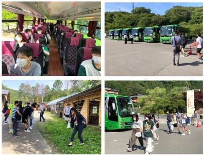 修学旅行2日目午前の活動は,料理体験です。生徒たちは体験先ごとに分かれ,バスで会場へ向かいました。先ほど会場に到着したようです。本日もいい天気です。