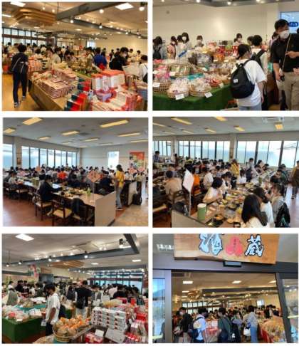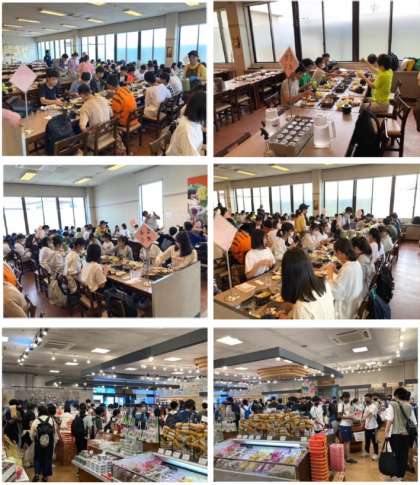 「ドライブイン酒蔵」での昼食の様子です。コロナ対策のため1〜3組は先に昼食をとり,4〜6・8組は先にお土産を買っています。30分ほどで交代し,お土産を買った生徒は昼食を,昼食を食べた生徒はお土産を買います。料理体験後にもかかわらず,生徒たちの食欲は旺盛です。
