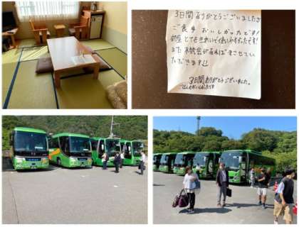 2日間お世話になったホテル天心も今日でお別れです。出発前には,自分の荷物の準備だけでなく,生徒たちで部屋内清掃も行いました。