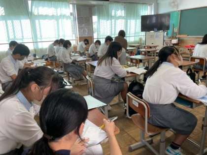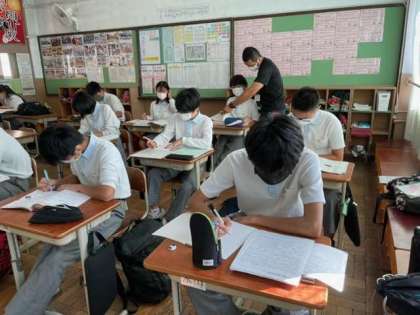 第3回テストの直前ということもあり、各教科のテスト範囲に関連する学習材料をそれぞれの生徒が持参し、午前中の限られた時間ではありましたが熱心に学習に取り組んでいました。教員へ質問する生徒も多く、今までわかりにくかった点や不安に思っていたことなどが解消できたのではないでしょうか。