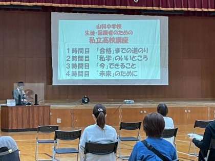 本日午後、今年度2回目の進路説明会を行いました。コロナ感染防止対策として、3年生生徒は教室にてオンライン配信で参加し、保護者の皆様は体育館にて蜜を避ける形で対面で実施いたしました。