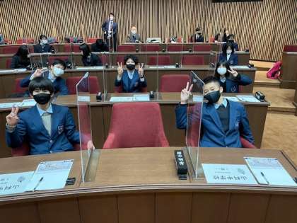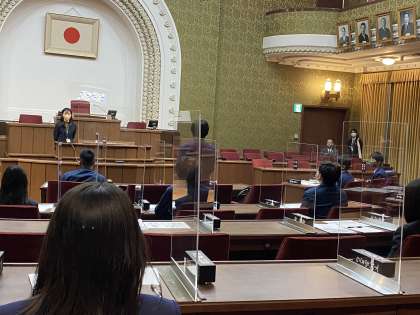 議場では、実際に市会議員の皆さんが着席する座席に座り、市会議員と議長のやり取りを視聴することができました。やり取りの最後では起立して賛成・反対の意思表示を行いました。