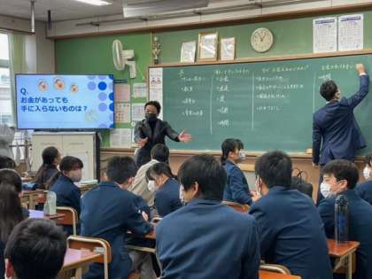 「お金で買えるもの、買えないもの」「何のために働くのか」など、自分たちの将来にとって大切ではあるがあまり真剣に考えたことがない事柄について、生徒たちの意見を引き出しながらご自身の経験も交えて非常にわかりやすくお話しいただきました。普段の学校の授業では得られない視点で考えることも多く、生徒の皆さんにとって新鮮な授業だったのではないでしょうか。