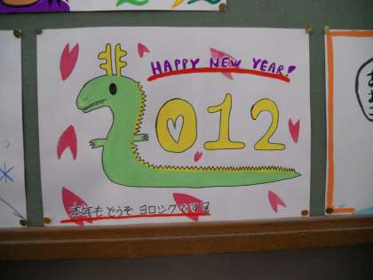 美術部では、いつも季節に応じた掲示物を制作、展示している掲示板(職員室横階段踊り場)があります。冬休み前に一足早いですが、美術部の皆で制作した「BIG年賀状」を展示しました。得意なイラストで描いたり、また干支の絵を描いたりなど楽しい年賀状ができあがりました。機会があれば一度ご覧ください。