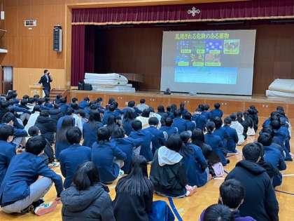 本日4限に、3年生対象の薬物乱用防止教室が体育館で行われました。非常に気温の低い中でしたが、大型ストーブで体育館内を温め、生徒は防寒着を着用して参加しました。