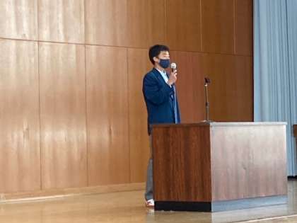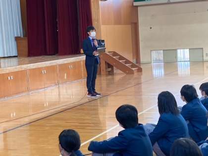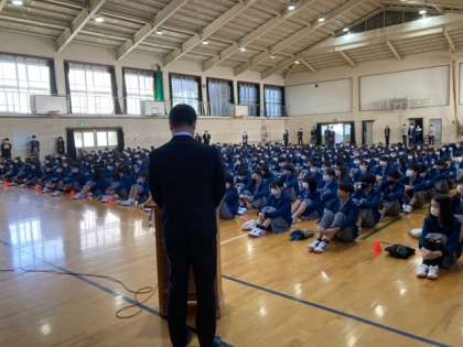 今年度最後の授業であり、この1年を振り返る良い機会といたしました。校歌静聴も通常通りの斉唱をマスク着用にて行い、久しぶりに体育館内に歌声が響きました。