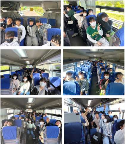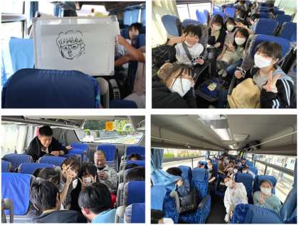 バス車内の様子です。どのクラスもレクレーションで盛り上がっているようです。