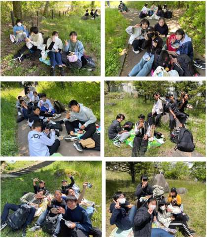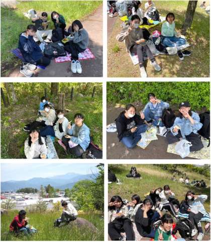 修学旅行団は予定通り昼食を終え、体験活動先へ向かっています。写真は昼食の模様です。現地も好天のようです。