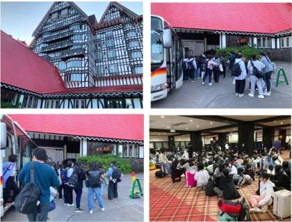 1日目のホテルに無事到着しました。「ホテルグリーンプラザ白馬」です。本日は学年全員でこのホテルに宿泊します。この後、夕食、学年レクレーション、入浴を済ませ、就寝することとなります。