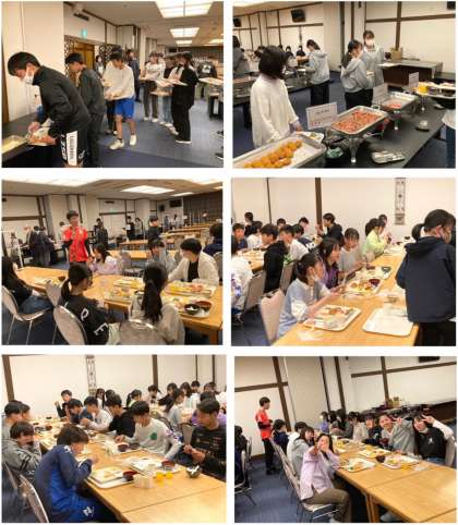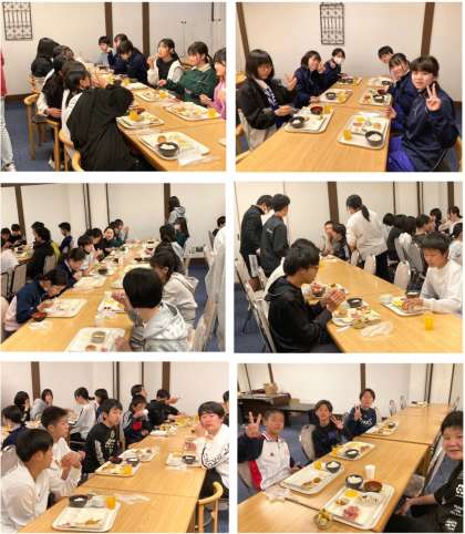 修学旅行団は朝食を済ませ、体験場所に向けてバスで出発するところです。写真は朝食時の様子です。本日は終日活動に取り組むこととなります。しっかり食べて、体験に備えてくださいね。