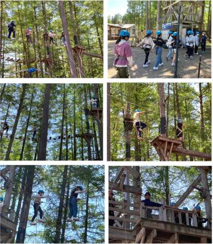 4組〜7組生徒たちは、現在「EXアドベンチャー」体験に取り組んでいます。フィールドアスレチックのような活動です。活動場所の天候は晴天ですが、風がやや強く、時折その影響で身体や器具が揺れ、生徒からキャー、ワォーと悲鳴に似た叫び声が聞こえます。