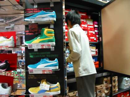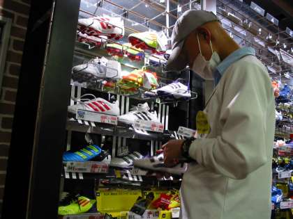 スポーツ用品店にて。試着した靴ひもを結び直したり、サイズごとに見やすく整理したり、色々仕事があるんですね。
