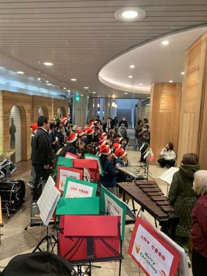 12月15日(日)ラクト山科「音の広場」にて吹奏楽部がクリスマスコンサートを実施しました。発表前には部員が「めっちゃ楽しむ!」と宣言していた通り、本番もアットホームで楽しい雰囲気で演奏し、会場に訪れてくれた人々を幸せいっぱいに包んでくれました。中には、通行中に足を止めて聴きいってくれる方も見られました。途中ソロの場面もありましたが、緊張にも負けずにのびのびと演奏してくれました。これからもどんどん練習に励み、多くの人々に幸せを運んでくれると思います。素晴らしい演奏をありがとうございました。関係者の皆様、貴重な場面をいただきありがとうございました。これからもどうぞよろしくお願いいたします。