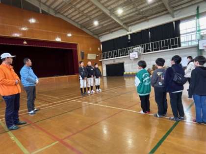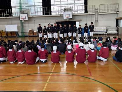 この数年、山科中より野球部がボランティアで参加し、体育館での開会式後に子ども達を相手にボールを使った遊びを伝授し、もちつきを待つ子供たちと楽しい時間を過ごしました。
