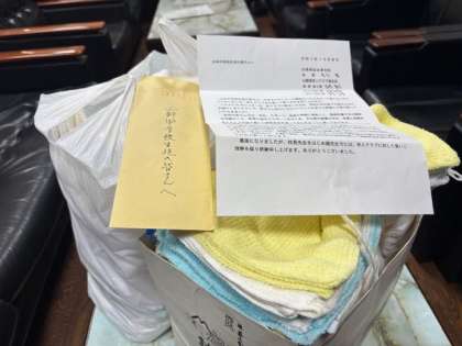 毎年、全校生徒が作成したカレンダーを贈ると共に、数年前からは「体育大会」の招待状もお渡しし、世代を越えた地域交流を続けています。そのお返しにと、毎年手作りの「雑巾」を学校へプレゼントしていただいています。この雑巾は生徒は大掃除や日々の清掃活動時に使わせていただいています。