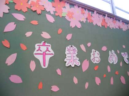 桜で飾り、3年生の皆さんの卒業をお祝いする気持ちを表しました。