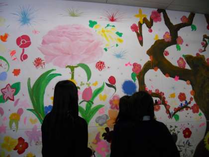 美術部では、秋から成安造形大学の教授や学生の方々と一緒に校舎内の壁面に描画をし装飾する活動を行ってきました。