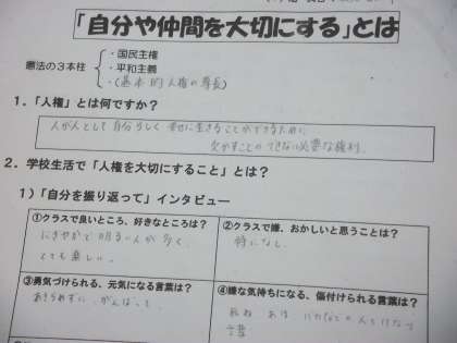 各学年ごとにテーマを定め、子供たちの意見や話し合いを中心に、自分自身や学級のこと、友達のことなど幅広く意見を出し合いました。ある学年では「自分や仲間を大切にする」とはというプリントを元に話し合いが進められていました。手を挙げて話し合ったことを堂々と発表している姿を頼もしく感じました。