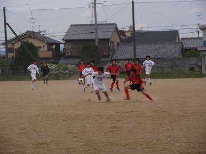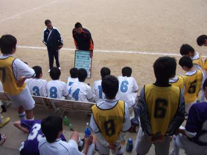サッカー部は5月3日、勧修中学校での1回戦に勝ち、4日附属桃山中学校での2回戦、対近衛中学校戦に臨みました。前半キックオフ直後に先制されますが、追いつき後半を迎えます。