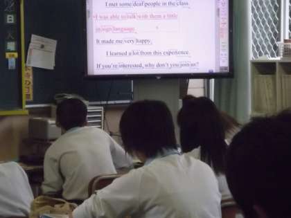 英語と音楽の授業です。英語はテスト範囲なのか真剣にシーンと。音楽は雅楽の演奏を楽しそうに聴いているところでした。