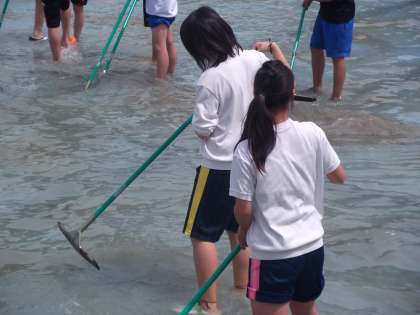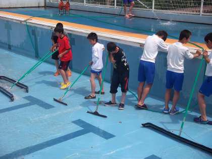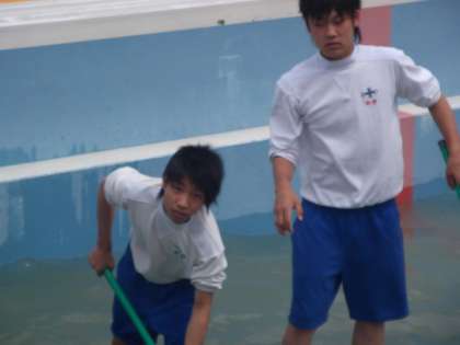 最初はなかなか水か引かなかったけれど、側面やプールサイドをきれいに洗ううちに、水のどんどん減っていきました。来週ゆっくり水を張って、いよいよ水泳の授業、夏の到来です。