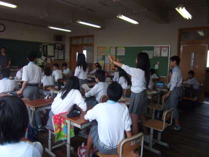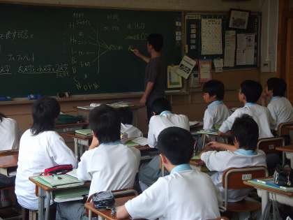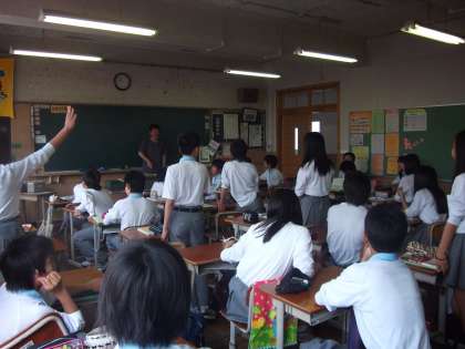 2年生の授業を教育委員会の先生と参観しました。元素記号の復習、先生のテンポの早い問いに、早い者勝ちで挙手をして答えてました。