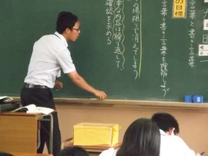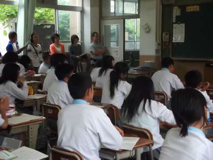 1年生の音楽と国語です。音楽は校歌の練習から。みんなしっかり歌えてました。国語は生徒達は緊張してか「シーン・・」という感じで、先生も少し緊張気味だったかも。