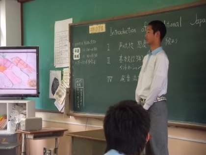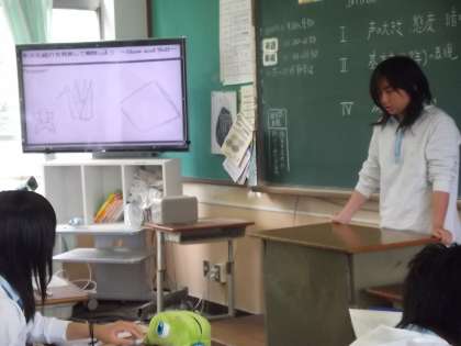 英語は日本の文化を紹介するスピーチです。みんなは、扇子、うちわ、畳、すし、金閣寺等々を紹介してました。