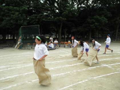障害物走、麻袋に足を入れ、みんな楽しく飛んでいました。