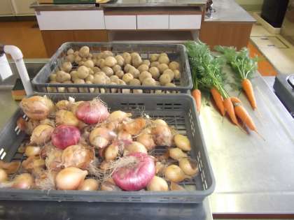 学校の畑で収穫した、タマネギ、ジャガイモ、ニンジンなどを使い調理実習を行いました。できあがったカレーは8組だけでなく、授業にきている先生方にも振る舞われました。美味しそうにできあがってましたね